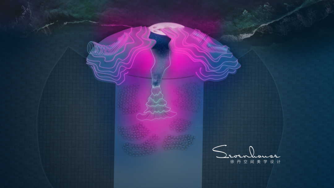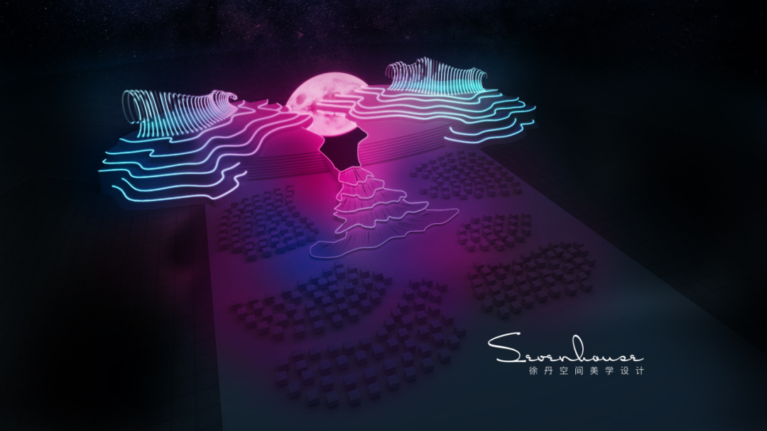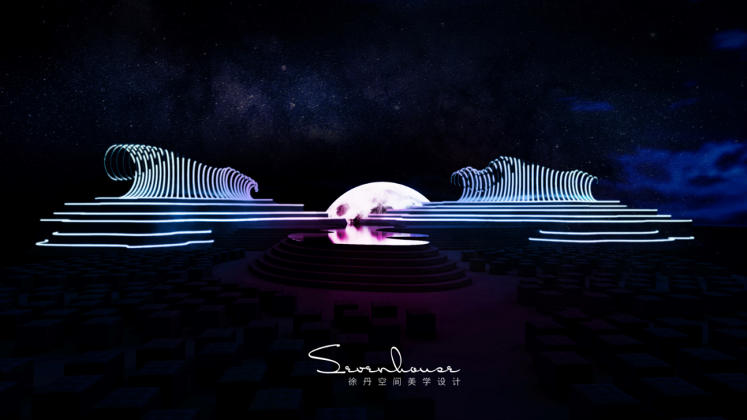 梯台设计灵感来源于婚纱的裙摆,整个梯台联通主舞台的镜面通道犹如一个月亮女神穿起了美丽的婚纱