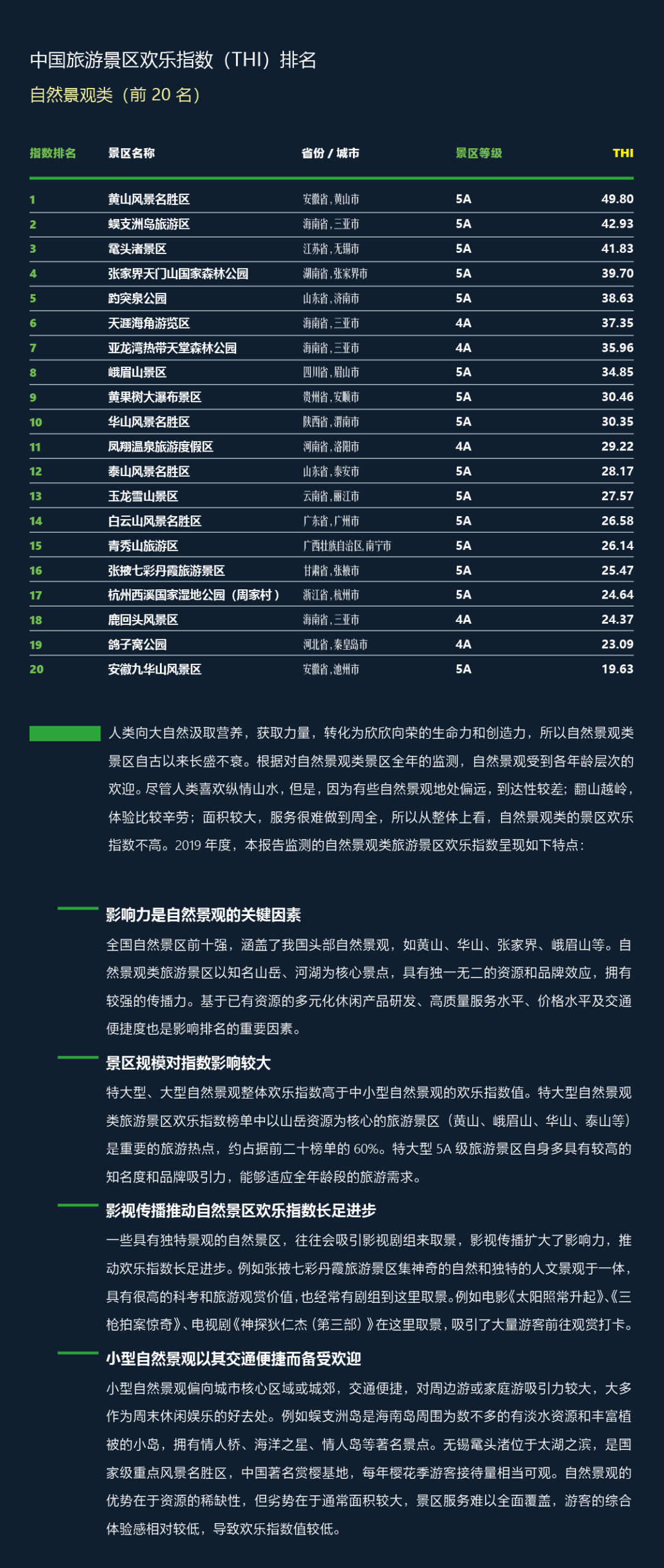 “中国旅游景区欢乐指数(THI)”研究运用大数据挖掘和分析技术,将语义分析技术引入旅游评价领域,顺利获得在全国选取1181个景区样本召开为期一年的旅游大数据的跟踪研究,研究所设计的景区分类以中国旅游景区协会发布之团体标准《旅游景区分类》(T/CTAA0001-2019)为依据,从研究的底层逻辑上实现对传统评价方式的完善。基于游客在游玩后的线上评论数据,顺利获得评论的语义识别转化成可量化的指数精准客观地反映游客体验、跟踪消费者偏好给予了支持工具。